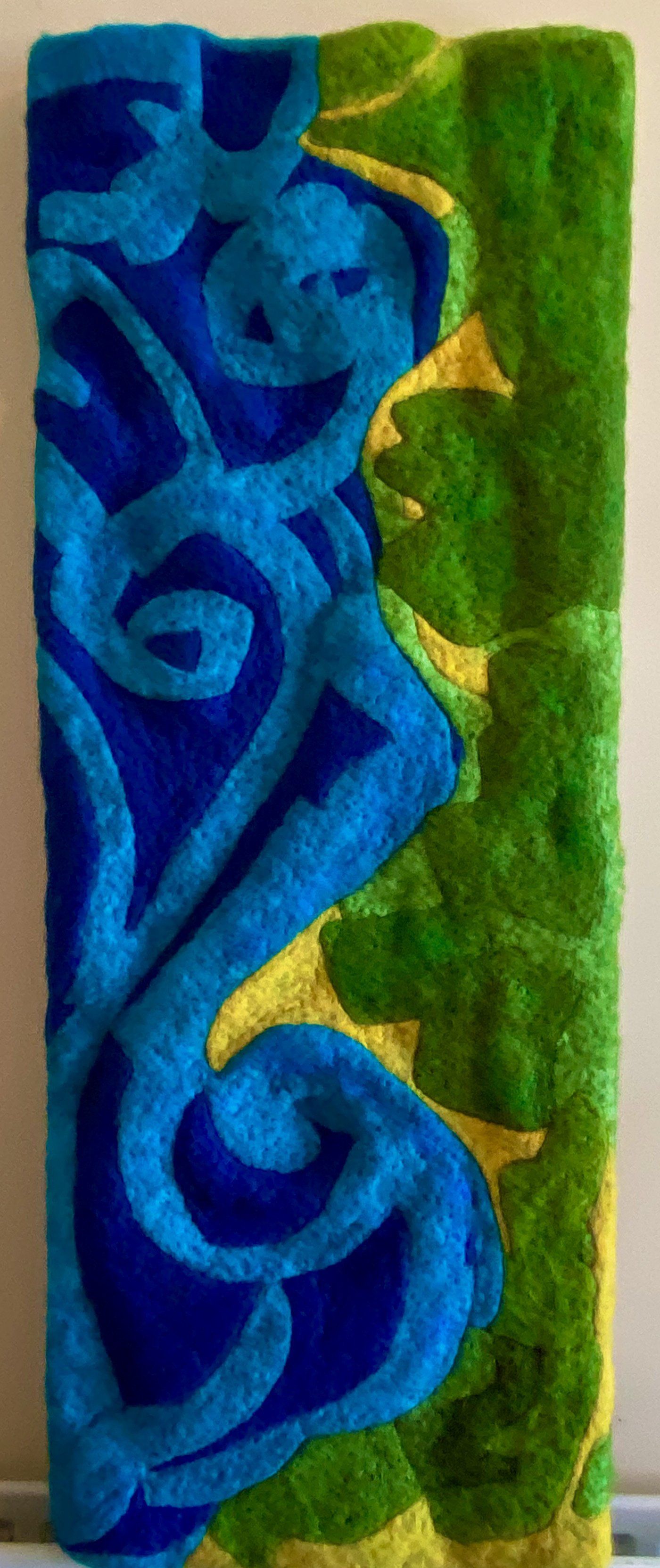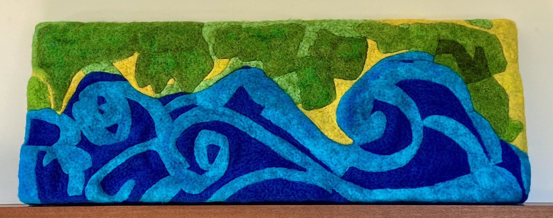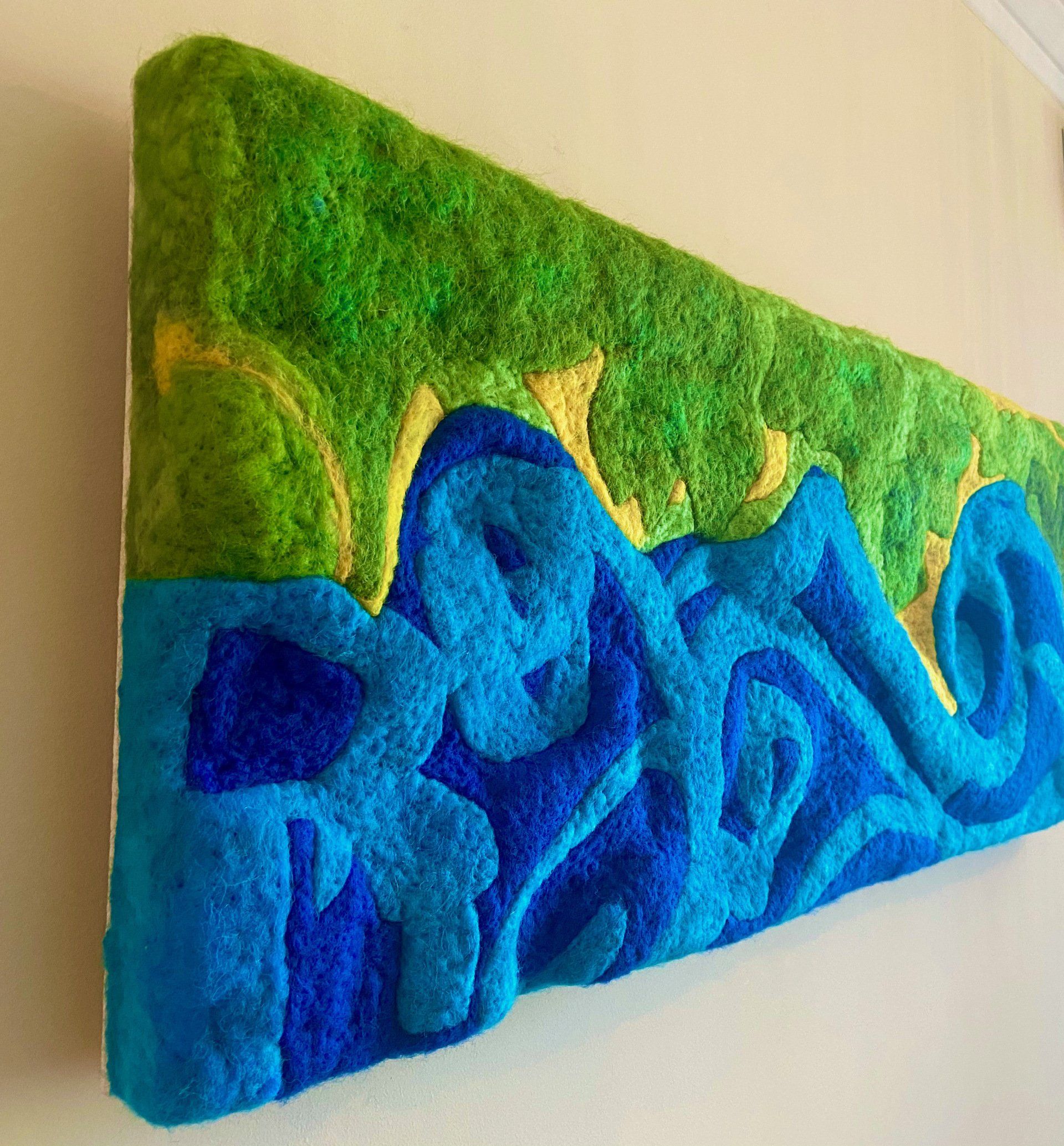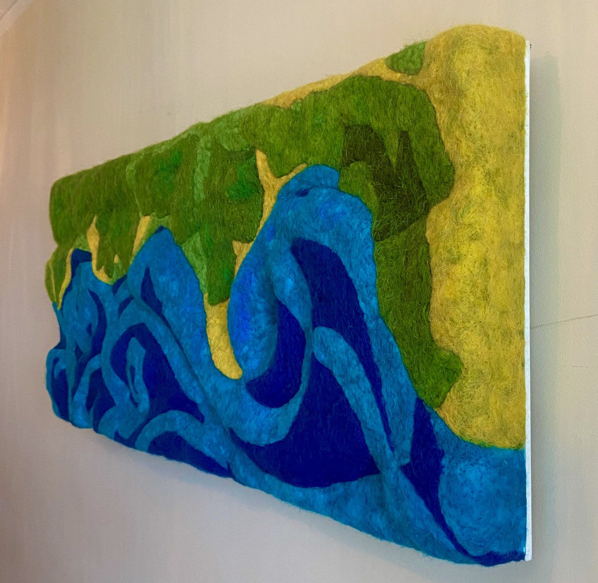 "Spring Tidal Waves on the Ards Peninsula'. By H. Sharkey. Unique Dry Felted Low Relief Sculpture, 45cm x 122cm x 12cm. Mixed media. £2,400. Can be hung four ways"