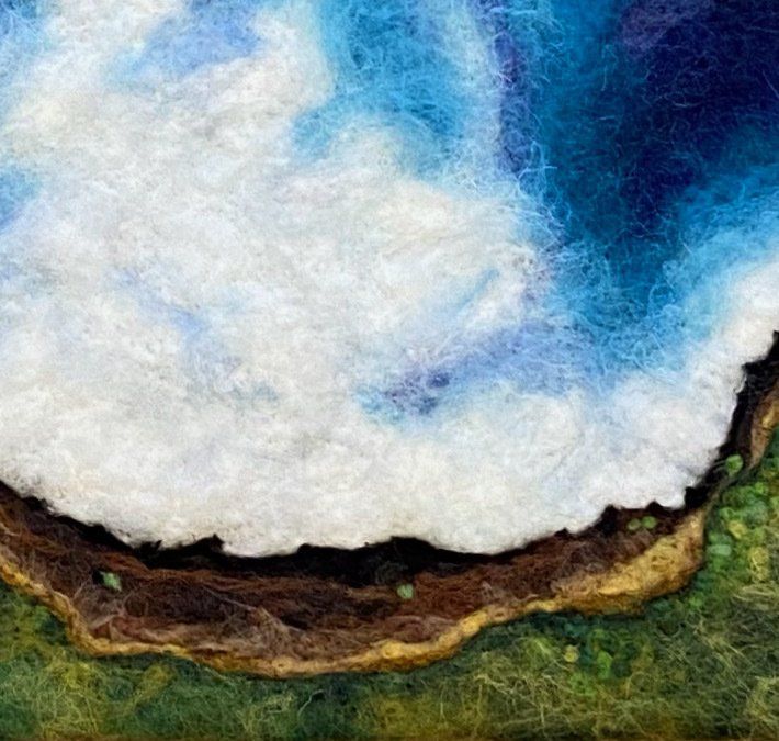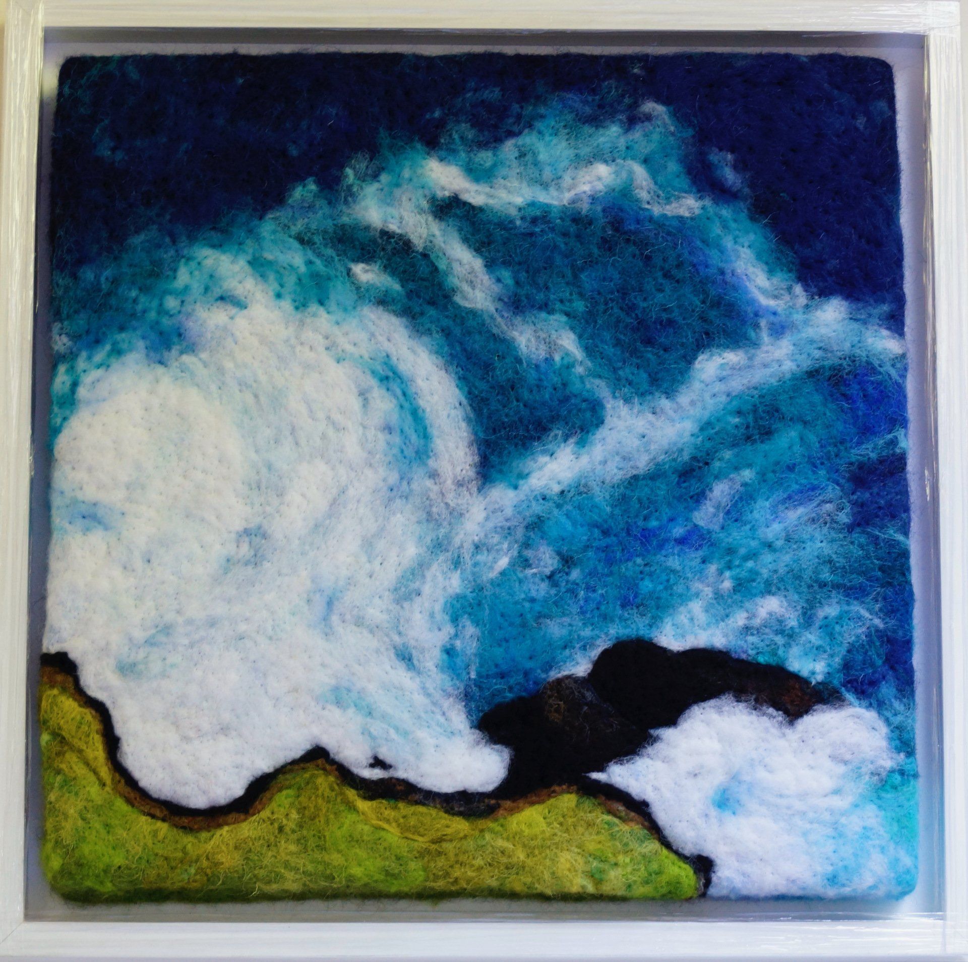 "Panoramic Atlantic Cliff View". Large unique needle felted textile, mixed media. 52cm x 52cm x 7cm. Framed - £450.